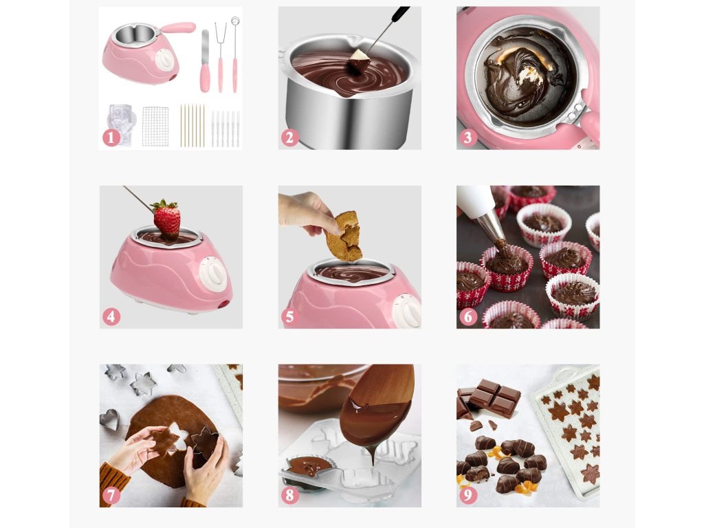 - Odporúčame používať čokoládu pripravenú na fondue pre lepší výkon a trvanlivosť (nie je súčasťou balenia)