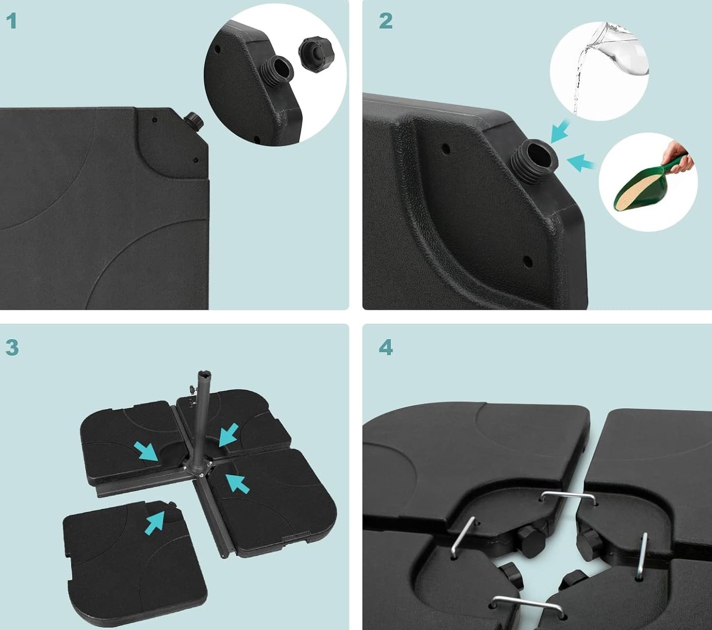 Objavte tajomstvo efektivity. Podstavec pod slnečník tvoria 4 diely, ktoré je možné naplniť vodou alebo pieskom. Takto môžete dosiahnuť vyššiu hmotnosť, a tým aj vyššiu stabilitu.
