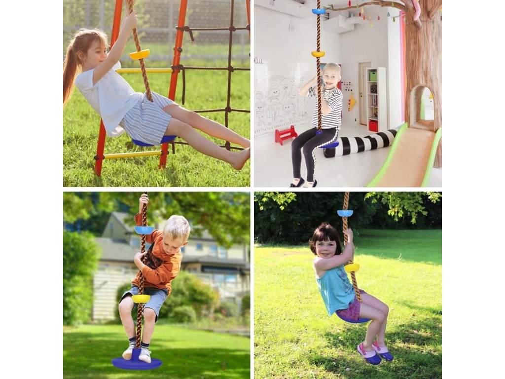 Kotúčová hojdačka s lezeckým lanom je skvelá pomôcka na rozvoj motorických schopností, koordinácie, sily a vytrvalosti. Dieťa si môže hravou formou posilniť celé telo.