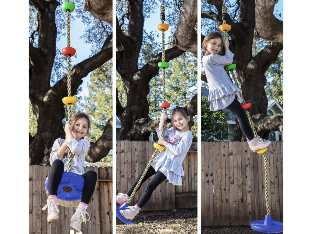 Premeňte svoju záhradu na centrum smiechu a zdravého pohybu behom chvíľky. Kotúčová hojdačka s lanom na lezenie je vybavená praktickou karabínou, pomocou ktorej ju jednoducho zavesíte na vhodné miesto, ako napríklad pevný konár alebo trám.