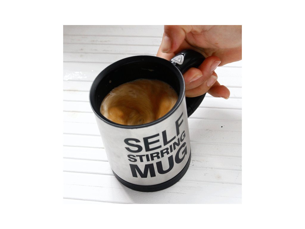 Samomiešajúci hrnček je absolútne výstižný názov pre tento jedinečný hrnček. Nalejte kávu alebo čaj, stlačte tlačidlo a nápoj sa Vám sám zamieša. Nie je nič jednoduchšie. Teraz už nemusíte špiniť lyžičku a namáhať sa miešaním kávy. Lenivý hrnček obstará miešanie za vás.