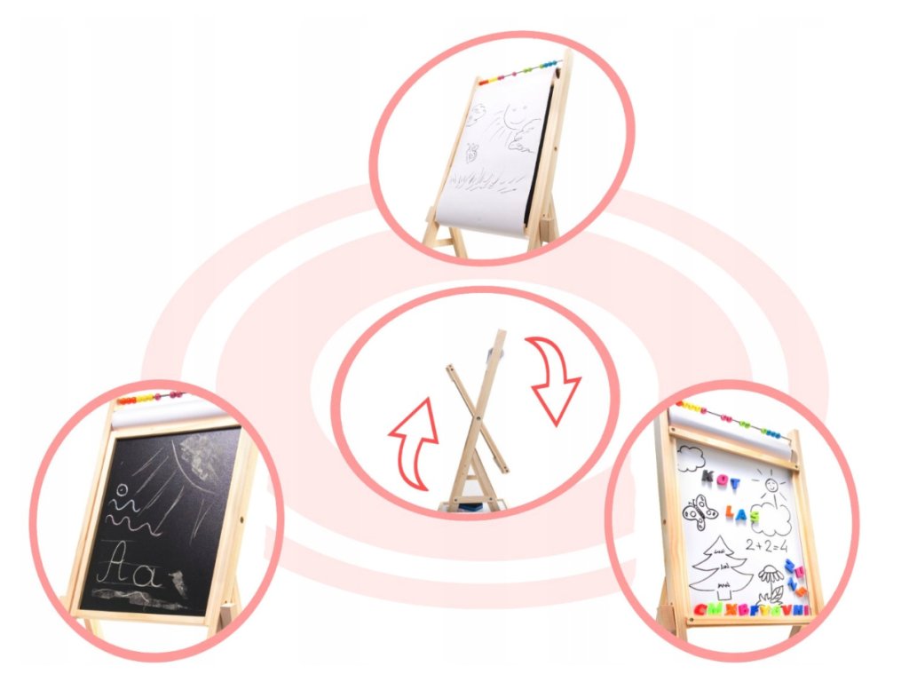 Veľkou výhodou multifunkčnej tabule je otočný rám, vďaka ktorému sa deti ľahko prepnú medzi dvoma stranami tabule – bez nutnosti odkladať pomôcky.