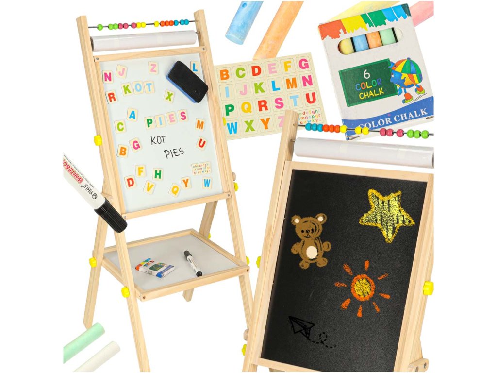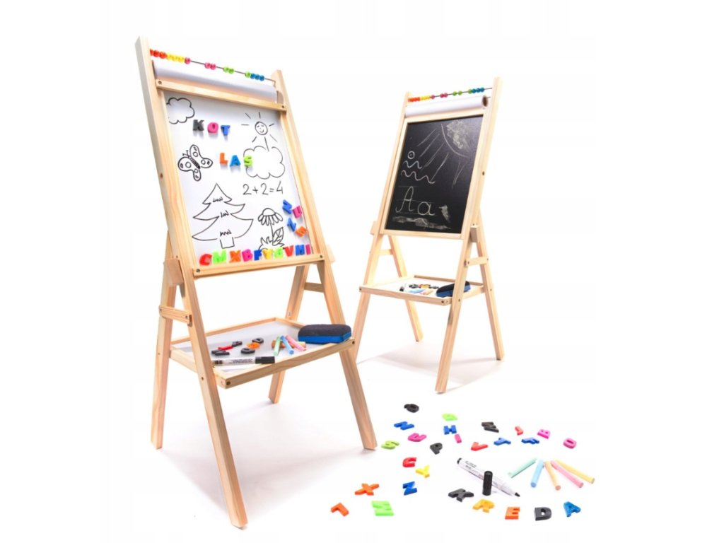 Jedinečná obojstranná tabuľa umožňuje kreslenie fixkou na bielu magnetickú plochu a písanie kriedami na klasickú čiernu stranu. Dieťa si tak môže trénovať jemnú motoriku, učiť sa písmenká, čísla alebo jednoducho rozvíjať svoju predstavivosť. Povrch tabule je ľahko umývateľný a pripravený na ďalšiu tvorbu.