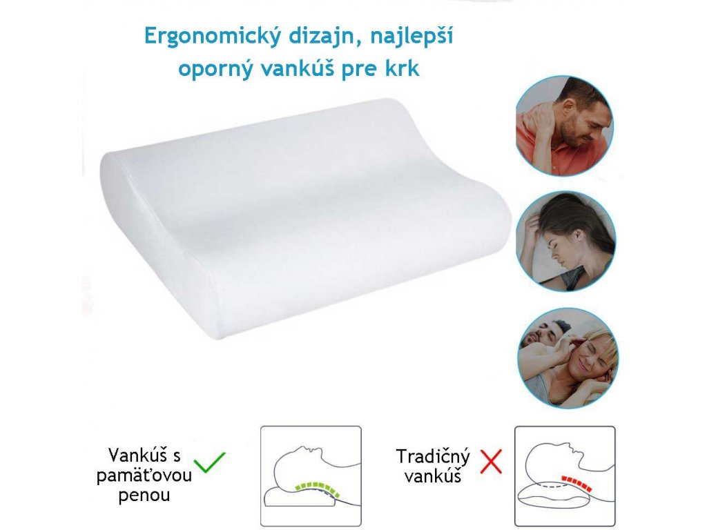 Anatomický vankúš na je vyrobený zo 100% prémiové kvalitnej pamäťovej peny, ktorá poskytuje dlhotrvajúci komfort, aký Vám nedoprajú iné vankúše. Unikátny ergonomický tvarovaný dizajn udržuje vašu chrbticu v optimálnom vyrovnaní a počas spánku a zlepšuje krvný obeh.