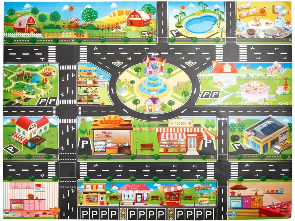 Unikátna hracia podložka s mestským motívom podporuje kreativitu detí a umožňuje im vytvoriť si vlastné mesto podľa vlastnej predstavy. Vďaka pribaleným značkám sa každá hra stáva jedinečnou a interaktívnou. Dieťa si samo vyberá, kam umiestni značky a ako bude jeho mesto vyzerať – rozvíja pri tom priestorovú predstavivosť, jemnú motoriku aj samostatnosť.