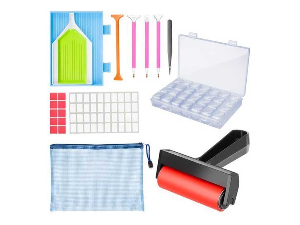 Sada na diamantové maľovanie je mimoriadne praktický doplnok, obsahujúci okrem iného aj valček na lisovanie a zarovnávanie diamantov.