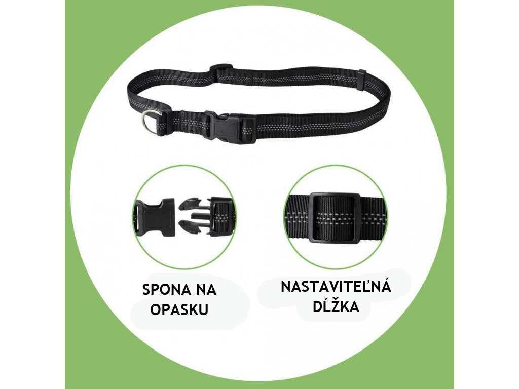 Pás ktorý je súčasťou vodítka výborne obopne telo a skvele drží pri behaní, cvičení, turistike, jazde na bicykli a inom športe. Je vybavené spoľahlivou zacvakávacou karabínou, vďaka ktorej vodítko pripevníte k obojku behom sekundy. Navyše prevedenie vodítka je moderné a štýlové.